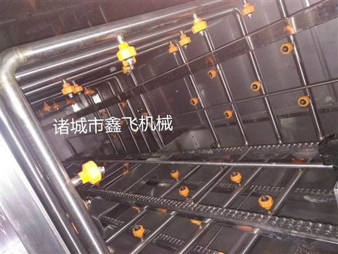 周轉(zhuǎn)筐清洗機(jī)設(shè)有氣泡發(fā)生裝置,利用氣泡的上下翻滾將蔬菜上殘留的泥沙和殘留農(nóng)藥等雜質(zhì)清洗干凈,并配有網(wǎng)帶輸送裝置可以將被清洗的蔬菜不斷向前推進(jìn),在出水面的時候會有噴淋裝置對蔬菜進(jìn)行高壓沖洗進(jìn)一步把蔬菜上的殘留雜質(zhì)清洗一遍,在蔬菜清洗機(jī)的末端裝置一個風(fēng)機(jī)可以將蔬菜表面的水分吹掉一部分,更方便了下一步的加工。